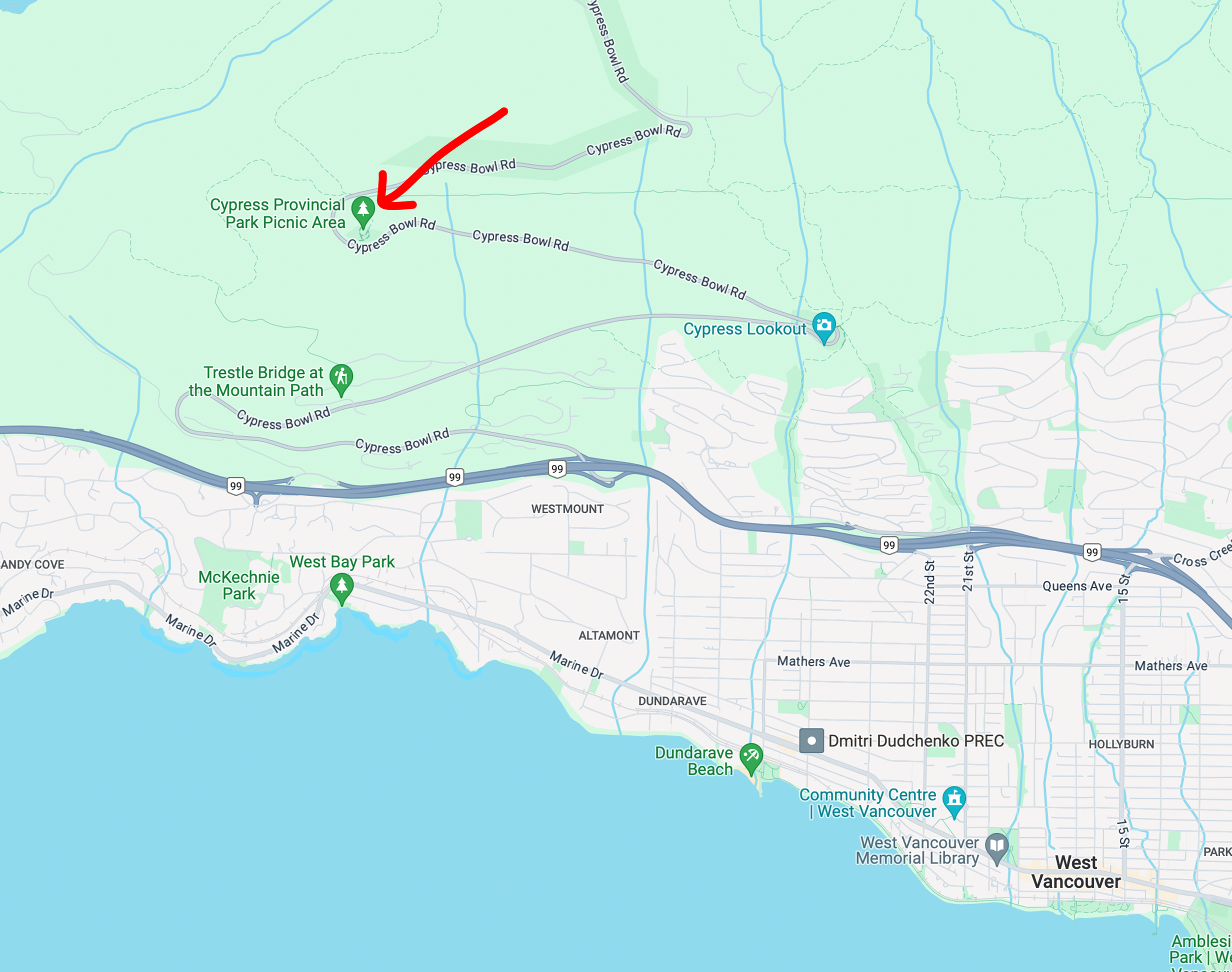 In Google Maps, search Cypress Provincial Park Picnic Area to find our location.